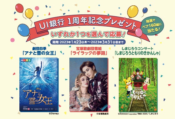 皆さまへの感謝の気持ちを込めて、2023年1月23日(月)~2023年3月31日(金)の期間中、抽選で160組(320名)にペアチケットが当たる「UI銀行1周年記念プレゼント」キャンペーンを実施いたします。