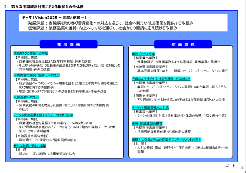 当機構は、損害保険にかかるインフラ機能の強化を通じて持続可能な社会の実現に貢献していくことを目指し、本計画における各課題を遂行してまいります。