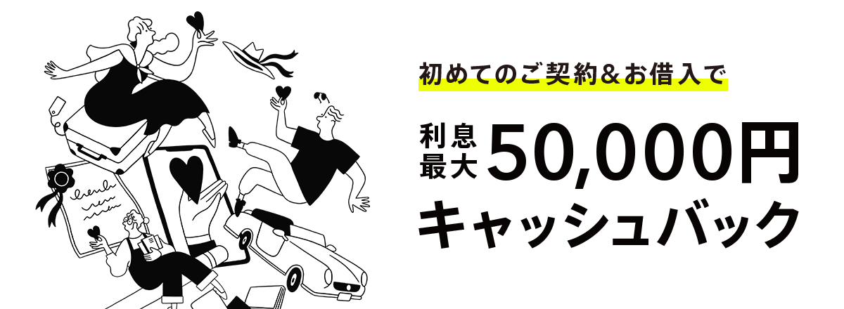 | 内容 | 対象期間のお支払利息最大2ヶ月分(ご利用開始月分とその翌月分)を合算して一括 キャッシュバック(還元上限50,000円)