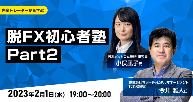 株式会社外為どっとコム(本社:東京都港区、代表取締役社長:竹内 淳)は、明日2月1日(水)19時より、当社主催の無料オンラインセミナー『先輩トレーダーから学ぶ!脱FX初心者塾 Part2』を開催することとなりましたので、お知らせいたします。