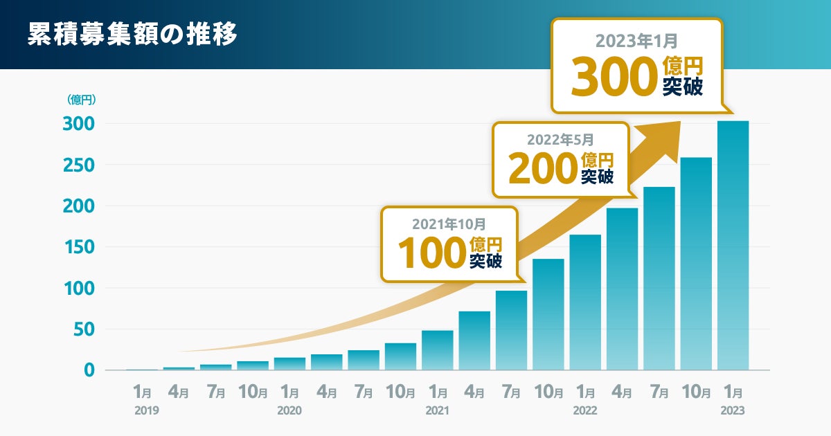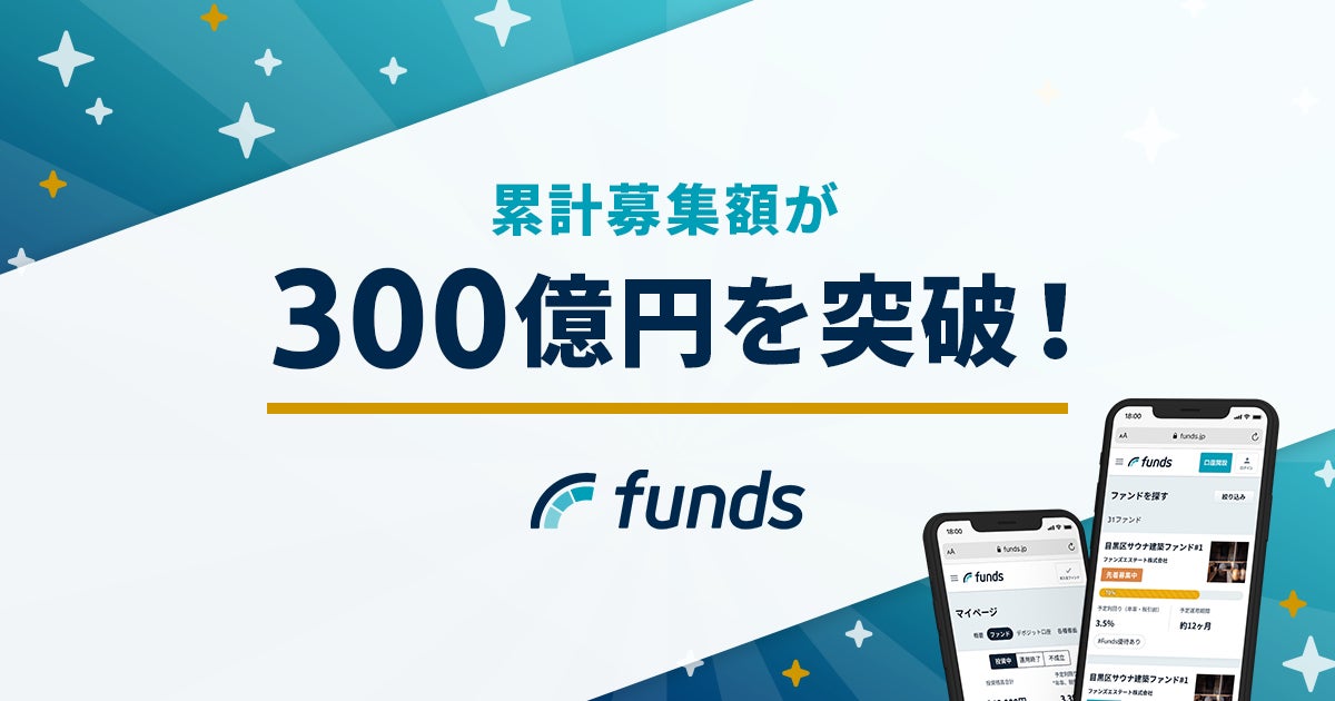 投資家の皆さまには新たな資産形成の選択肢の一つとして固定利回りの資産運用のFundsをご利用いただき、おかげさまで累計の募集額が300億円を突破しました。