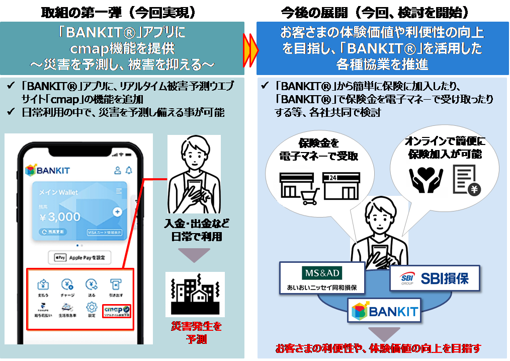 本協業の取組の第一弾として、アプラスが提供するネオバンク・プラットフォーム「BANKIT®(※1)」に、あいおいニッセイ同和損保のリアルタイム被害予測ウェブサイト「cmap(シーマップ)」の機能を新たに追加します。これにより、入出金など日常の「BANKIT®」利用シーンの中で、万が一の災害を予測し、被害の未然防止に資するサービスをお客さまに提供することが可能となります。