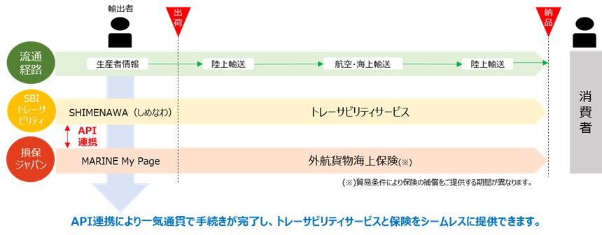 「SHIMENAWA(しめなわ)」のトレーサビリティサービスを利用する輸出者(生産者)が外航貨物海上保険の手配を希望される場合に、同プラットフォーム上の情報を「MARINE My Page」にAPI連携することで、トレーサビリティサービスと保険の申込みがシームレスに完結します。
