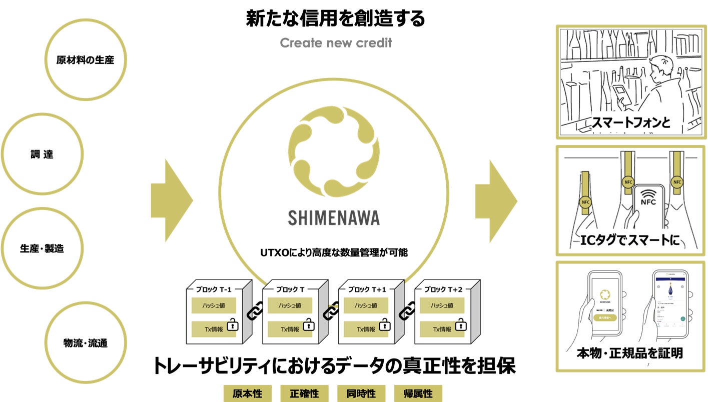 「SHIMENAWA(しめなわ)」は、ブロックチェーンを活用し、ユニークIDが記録された厚さ0.1ミリのICタグやQRコードを商品に張り付けることで、消費者はスマートフォンを商品にかざすだけで、商品の開封有無だけでなく、生産者や商品に込められた想い(ストーリー)、流通履歴や産地を「見える化」することができます。商品の安全性だけでなく、真贋証明およびサプライヤーのブランドや新たな信用を創造することにも繋がります。