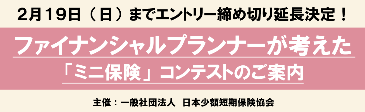 ファイナンシャルプランナーが考えた「ミニ保険」コンテストの申し込み締め切りを2月19日(日)まで延長することを決定いたしました。(エントリーシート:https://www.shougakutanki.jp/general/info/2022/2023Contests.zip)