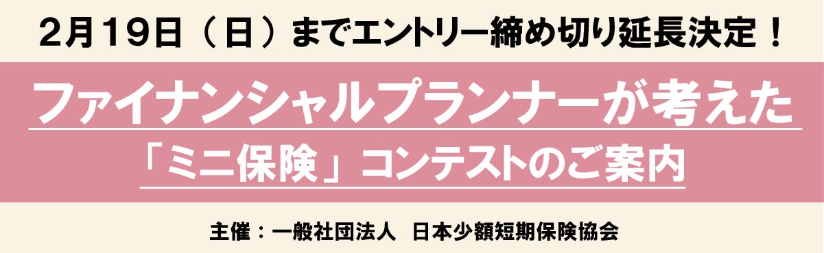 3月2日(木)15時よりオンラインで開催します【第9回少額短期保険(ミニ保険)の日 記念イベント】の企画の1つ「おもしろミニ保険コンテスト ファイナンシャルプランナー部門」のエントリー締め切りを多数のファイナンシャルプランナーの方から、エントリー締め切りの延長を望む声ををいただき、2月19日(日)まで延長することとなりました。