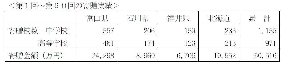 ・これまでの寄贈校数は北陸3県・北海道の中学校、高等学校で延べ2,126校、寄贈額累計は約5億円となっております。