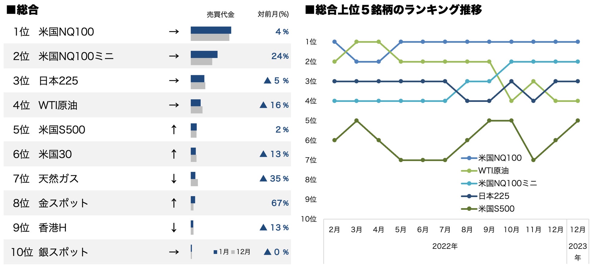 2023年1月は、米国のインフレ鈍化により景気悪化の懸念が和らいだことから米国株式市場が上昇傾向で推移しました。特に、NASDAQ100の月間上昇率が22年ぶりの大きさとなる約11%上昇となったことから、2023年1月のCFD売買代金ランキングにおいても引き続き「米国NQ100」、「米国NQ100ミニ」が総合首位と2位にランクインしました。また、中国がゼロコロナ政策を大幅に緩和したことが好感され中国株が上昇したことから、香港証券取引所で取引される流動性の高い中国企業50銘柄からなる「FTSE中国50指数」のETFであるDirexion FTSE 中国株ブル3倍ETFを参照原資産とする「中国ブル3倍ETF」の売買代金が大きく伸長しました。