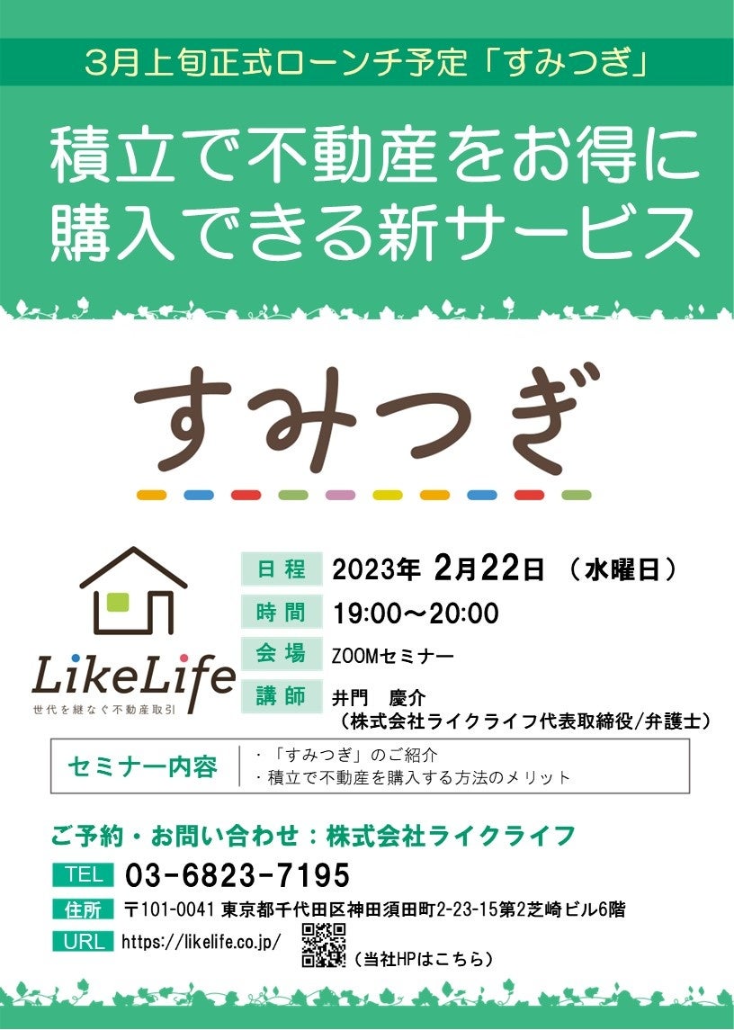 株式会社ライクライフ(本社:東京都千代田区、代表取締役:井門慶介)は、3月上旬に正式ローンチ予定の不動産取引プラットフォーム「すみつぎ」のサービス説明会を2月22日(水曜日)19時より開催することをお知らせします。
