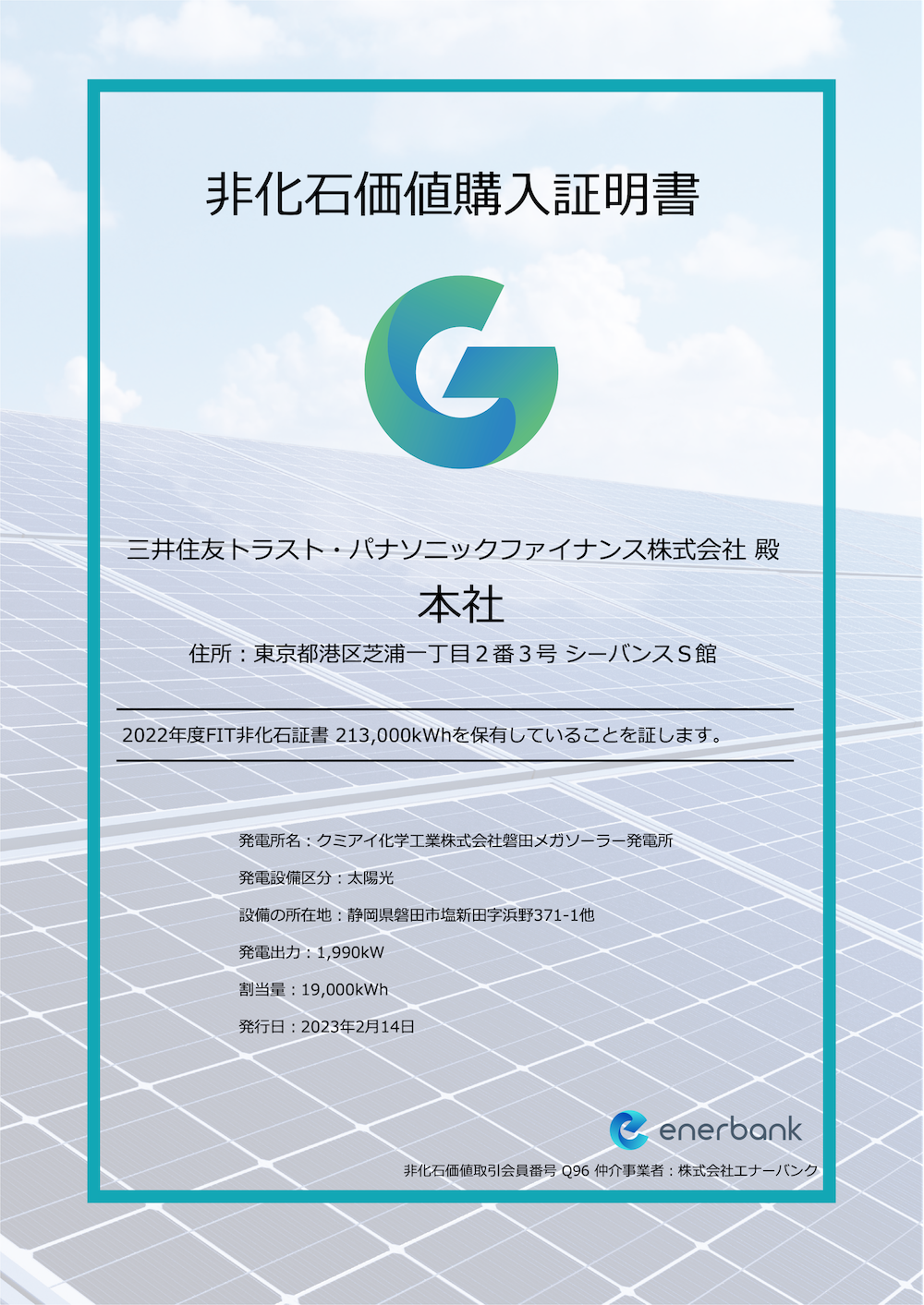 三井住友トラスト・パナソニックファイナンス株式会社はカーボンニュートラル宣言に則り、2030年までに自社の温室効果ガス排出量ネットゼロを目指しています。今回、三井住友トラスト・パナソニックファイナンス株式会社は当社の「グリーンチケット」非化石証書購入代行サービスを活用し、トラッキング付きFIT非化石証書を購入しました。この購入により、三井住友トラスト・パナソニックファイナンス株式会社の国内のすべての拠点における電力使用量約95万kWhは、100%実質再生可能エネルギー由来となり、企業全体として約413t-CO2相当の温室効果ガス排出量の削減となります。