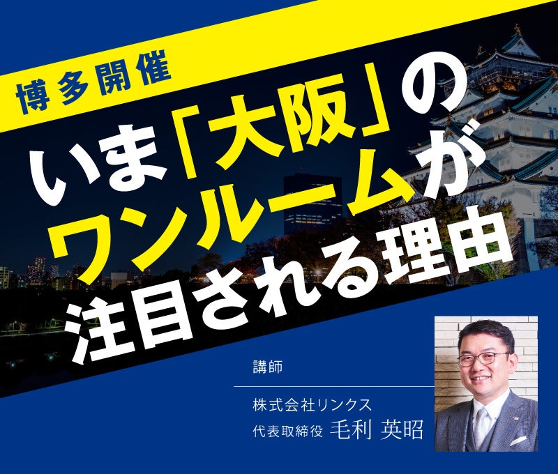 大阪駅前うめきた2期(グラングリーン大阪)再開発、大阪・関西万博、IRなどの話題が続く大阪市中心部のワンルームマンションに特化した不動産投資で資産形成をサポートする株式会社リンクス(大阪府大阪市、代表取締役 毛利英昭、以下「当社」)は、『いま「大阪」のワンルームが注目される理由』をテーマに福岡・博多で不動産投資セミナーを開催します。