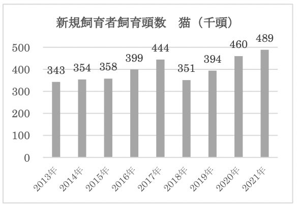 日本ペットフード協会によると、コロナ前の2019年にくらべコロナ渦中にあった2020年、2021年の猫の新規飼育頭数は大きな伸びを見せています。コロナ禍を機に猫を飼いはじめるひとが増えたといえます。