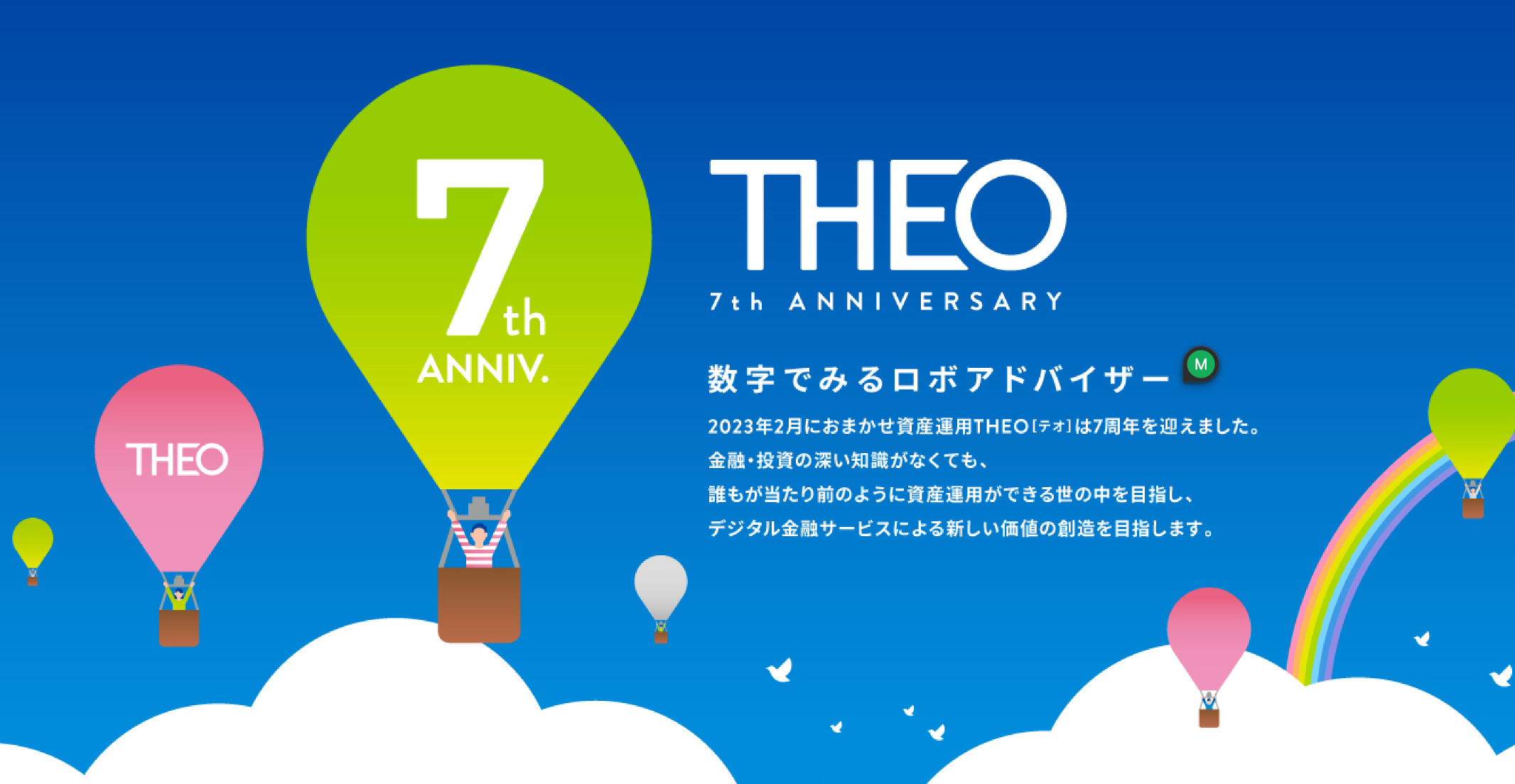 先進的なデジタル資産運用を提供する株式会社お金のデザイン(本社:東京都港区、代表取締役社長:山辺 僚一)が提供する、おまかせ資産運用 THEO[テオ] は、2023年2月16日(木)に7周年を迎えました。多くの皆さまにご愛顧いただき、運用者数は12万人を超え、運用金額も1,600億円(2023年1月31日時点)まで成長しました。