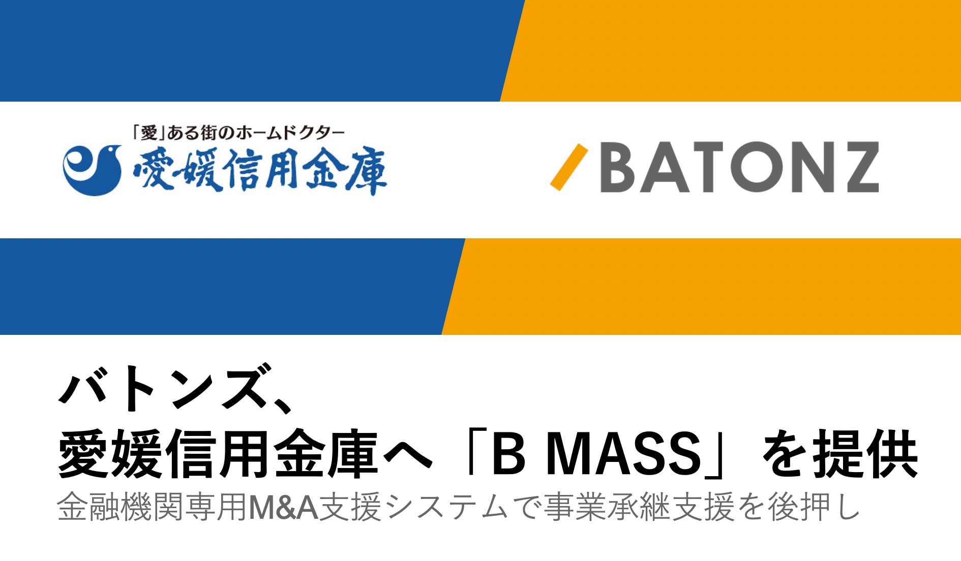 M&A総合支援プラットフォーム「BATONZ(バトンズ)」を運営する株式会社バトンズ(本社:東京都中央区、代表取締役:神瀬 悠一、以下バトンズ)は、愛媛信用金庫(本社:愛媛県松山市、理事長:八石 玉秀、以下愛媛信用金庫)へ金融機関専用M&A支援システム「B MASS(ビーマス)」(以下「B MASS」)の提供を開始したことをお知らせします。