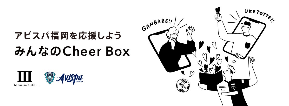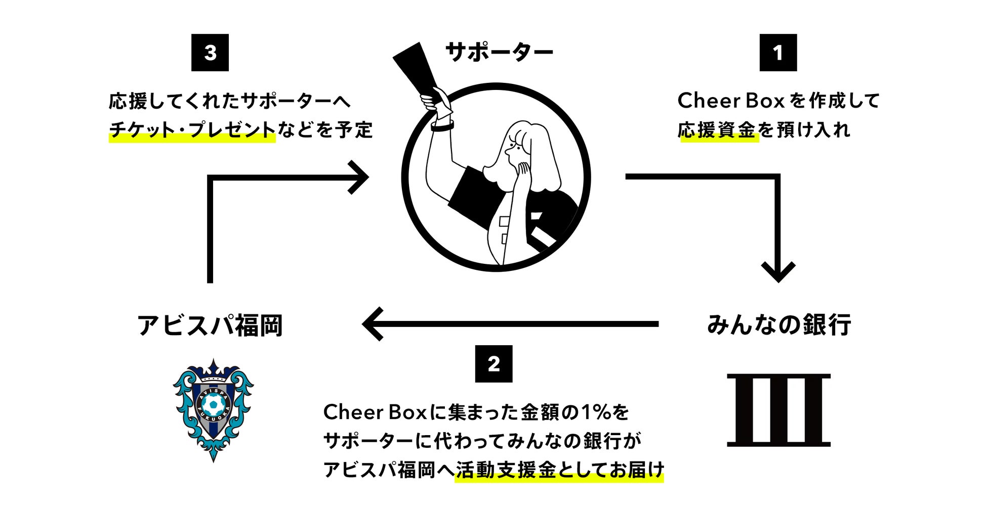 今回のパートナーシップの一環として、「みんなのCheer Box」の枠組みを活用した「アビスパCheer Box」を実施することで、みんなの銀行がサポーターの「預金」を「応援」(=活動支援金)に変えて、アビスパ福岡にお届けします 。