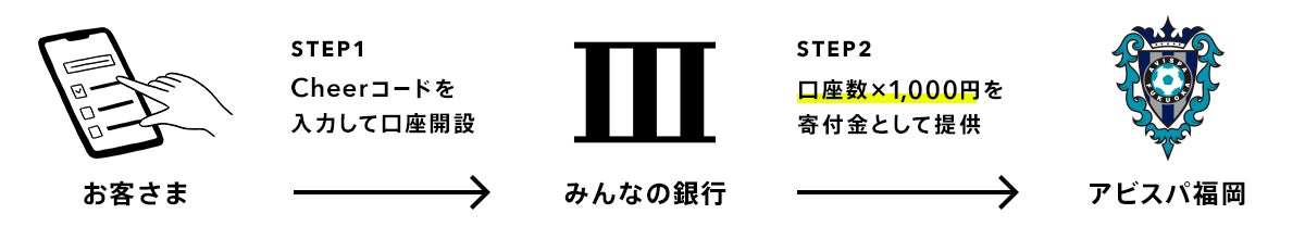 サポーターの皆さまが口座を開設する際、アビスパ福岡専用の「アビスパCheerコード」を入力するだけで、みんなの銀行からアビスパ福岡に活動支援金として 1,000 円をお届けすると同時に、口座を開設されたサポーターの方にも応援特典として 1,000 円をプレゼントします。