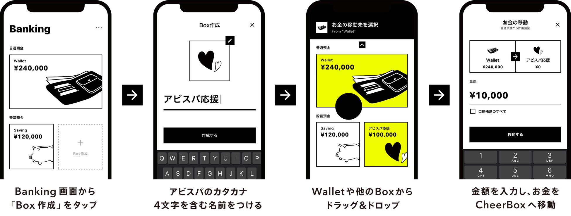 みんなの銀行では、 みんなの銀行アプリを通じて提供する目的別の貯蓄機能である 「Box」 を活用して 、 ファンの「応援したい気持ち」を 、チームやコミュニティの活動支援に つなげる 「みんなのCheer Box」 の取組みを実施しています 。