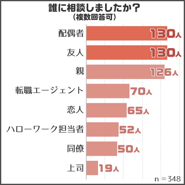 「誰に相談しましたか?」という問いに対しては、複数回答で「配偶者」「友人」「親」が1位・2位・3位で、ほぼ同着です。
