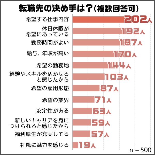 2位が「休日休暇が希望にあう」、3位が「勤務時間がよい」、5位が「希望の通勤地」と、いずれもライフワークバランスを重要視する回答が上位に上がっています。
