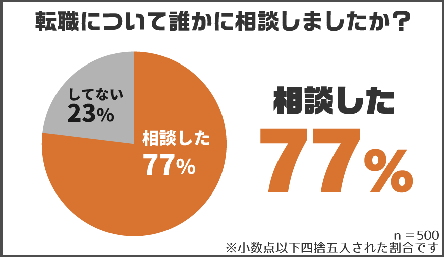 もしもあなたが1人で悩んでいたら、次の回答結果が参考になると思います。「転職について誰かに相談しましたか?」と伺ったところ、「相談した」と答えた方は77%でした。
