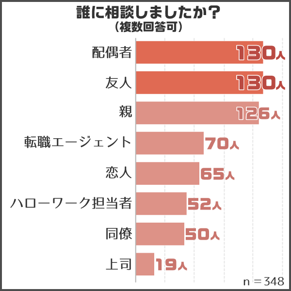 「転職エージェント」が4位、「ハローワーク担当者」が6位で、相談相手に専門家を選ぶ人は意外と少ないということがわかります。