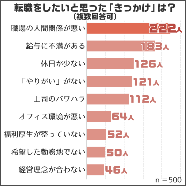 そこで今回は転職経験のある男女500人から、転職に関するアンケート調査を実施しました。本気で転職を考えている方、今の職場に何となく不満を感じている方も、ぜひこのアンケート結果を参考にしてみてくださいね。