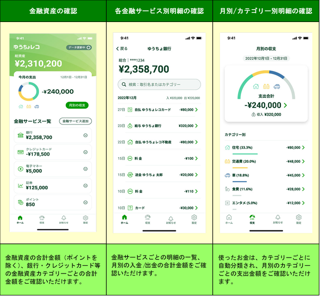 株式会社ゆうちょ銀行(東京都千代田区、取締役兼代表執行役社長 池田 憲人、以下「ゆうちょ銀行」)は、本日(2023年2月28日(火))から、スマートフォンを使って金融資産や毎月の収支の管理ができる家計簿アプリ「ゆうちょレコ」のサービスを開始しましたので、お知らせいたします。