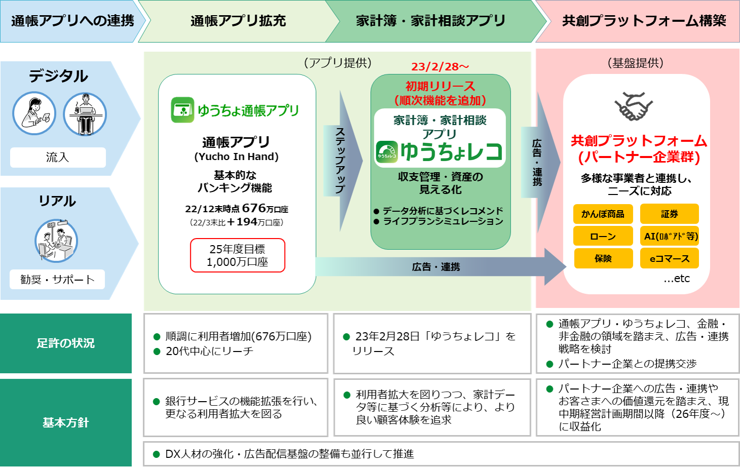 「ゆうちょレコ」は、「共創プラットフォーム」の中心となるアプリであり、今後は家計データ等に基づく分析等により、優れた顧客体験を実現するため、順次機能を追加していく予定です。