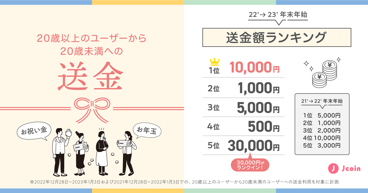 - お年玉・新成人お祝い金での送金利用が増加し、送金1件あたりの金額は2.3倍となり平均1万円を突破