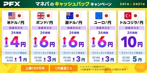 なお、指値系注文により発注・決済された注文は、24時間すべてのお取引でキャッシュバックをお受け取りいただけます。3月のキャッシュバックキャンペーンは、2月に実施したキャッシュバックキャンペーンに比べ、注文方法を問わずキャッシュバック金額が2倍・3倍に増額しています(「トルコリラ/円」を除く)。是非お取引にお役立て下さい。