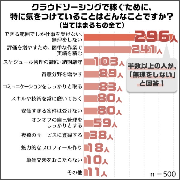 2番目に多かったのは「評価を増やすため、簡単な作業で実績を積む」という意見です。仕事を依頼したい人と受けたい人が手軽に出会えるクラウドソーシングですが、だからこそ「信用」が鍵となります。