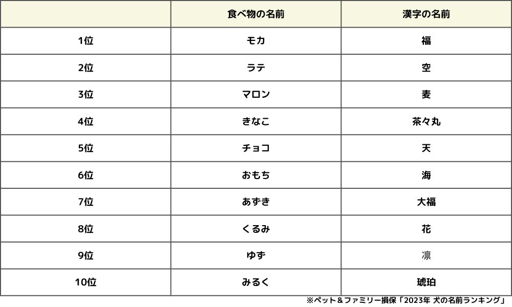 T&D保険グループのペット&ファミリー損害保険株式会社(本社:東京都台東区、代表取締役社長:三瓶 雅央、以下「当社」)は、2022年1月~12月に当社のペット保険に新規加入した0歳の犬の名前を調査・集計し、当社が運営するWebメディア「Pet News Storage(ペットニュースストレージ)」( https://www.petfamilyins.co.jp/pns/ )にて、「2023年 犬の名前ランキング」を発表いたしました。