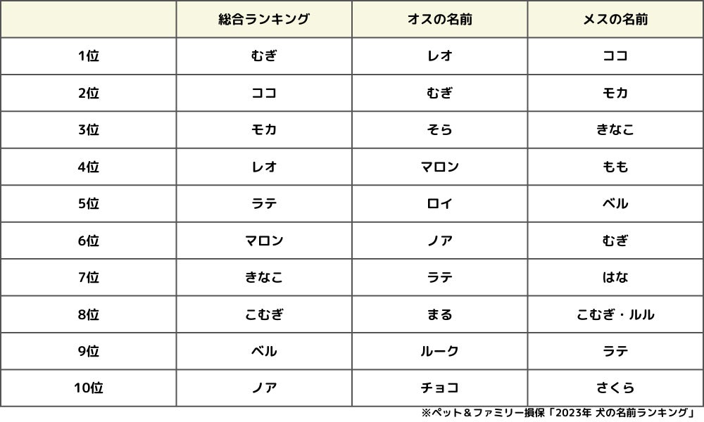 2022年の総合・オスの名前ランキングで、それぞれ1位を獲得した「むぎ」「レオ」は、2023年も1位を獲得し、「2023年 猫の名前ランキング」でも1位を獲得。犬猫ともに人気の高い名前となっています。
