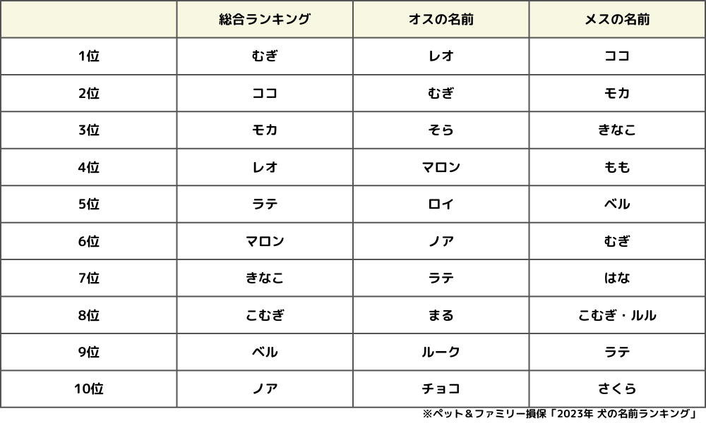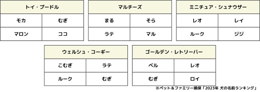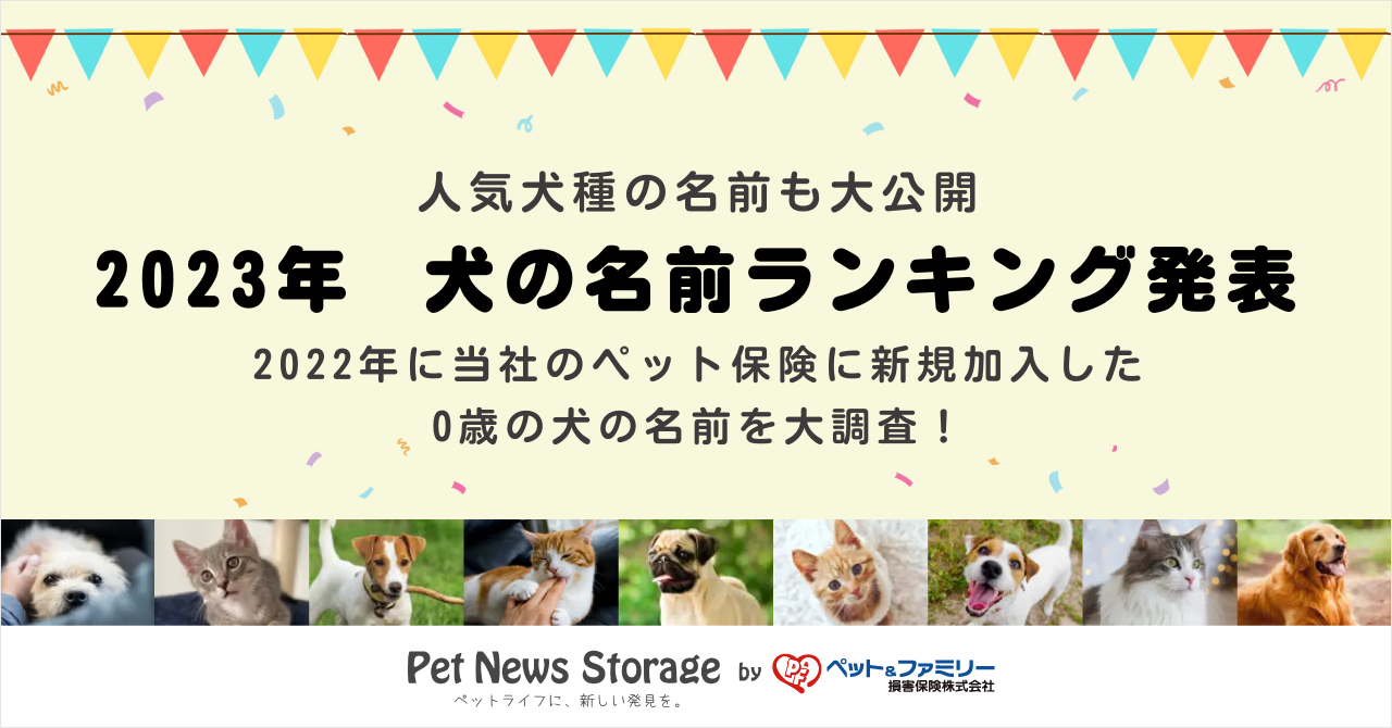 T&D保険グループのペット&ファミリー損害保険株式会社(本社:東京都台東区、代表取締役社長:三瓶 雅央、以下「当社」)は、2022年1月~12月に当社のペット保険に新規加入した0歳の犬の名前を調査・集計し、当社が運営するWebメディア「Pet News Storage(ペットニュースストレージ)」( https://www.petfamilyins.co.jp/pns/ )にて、「2023年 犬の名前ランキング」を発表いたしました。