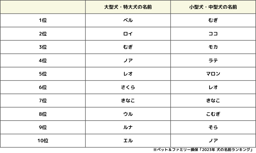 一方、大型犬・特大犬の名前は「ベル」「ロイ」「ノア」「レオ」と小型犬・中型犬と比べるとかっこいいイメージの名前が並びました。