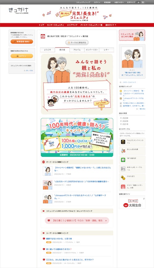 産経新聞社(東京都千代田区/代表取締役社長:近藤哲司)とクオン(東京都港区/代表取締役:武田隆)が共同で運営し、太陽生命保険株式会社(東京都中央区/代表取締役社長:副島直樹)が協賛する「みんなで話そう、100歳時代 親と私の“元気!長生き!”コミュニティ」は2023年3月現在、17,000人以上のユーザーが、自身や親の健康について自由に語り合う場として成長を続けています。本リリースでは、本コミュニティに関する最新のレポートを公開します。