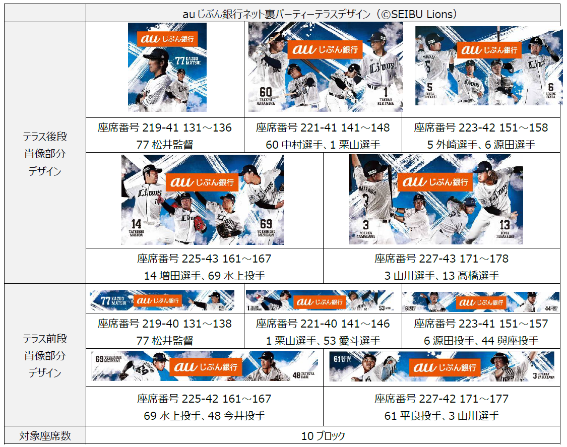 auじぶん銀行株式会社(本社:東京都中央区、代表取締役社長:石月 貴史、以下 auじぶん銀行)は、株式会社西武ライオンズ(本社:埼玉県所沢市、代表取締役社長:奥村 剛、以下 西武ライオンズ)が運営する、プロ野球・埼玉西武ライオンズの本拠地ベルーナドームの「auじぶん銀行ネット裏パーティーテラス」の壁面のデザインをリニューアルしました。