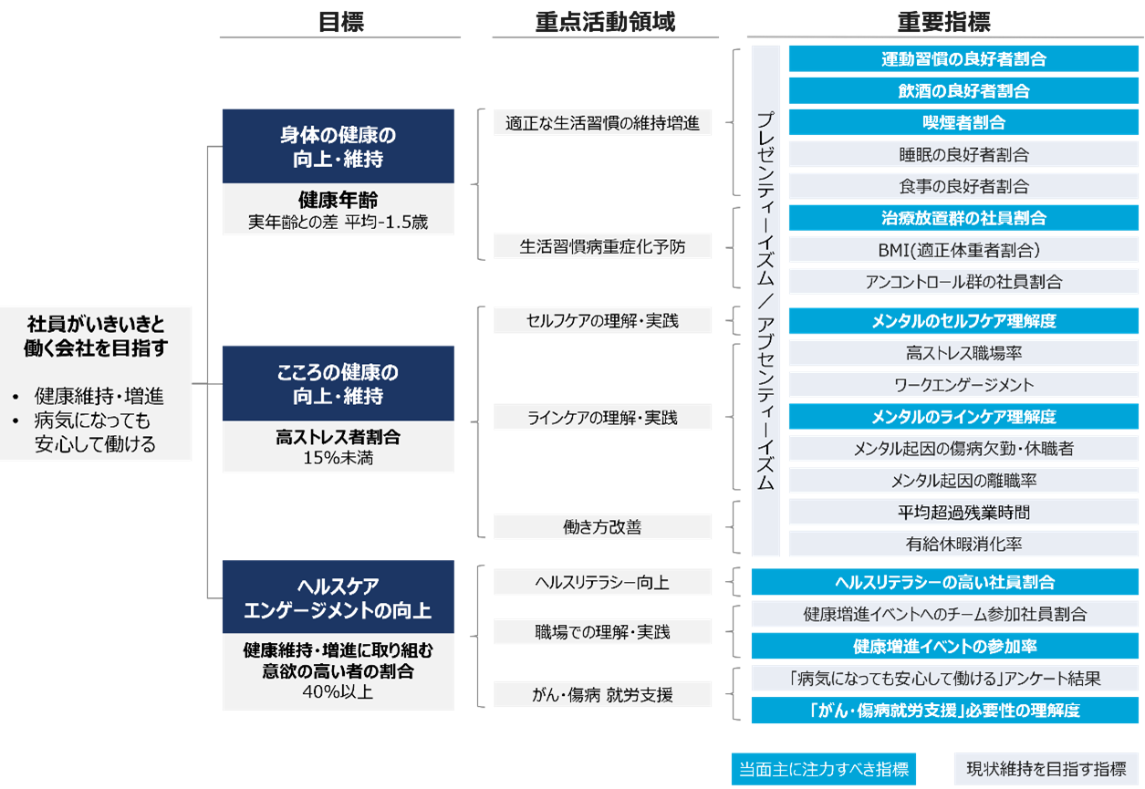 2022年には、経済産業省の「健康投資管理会計ガイドライン」に基づく「戦略マップ」を定め、「健康経営
