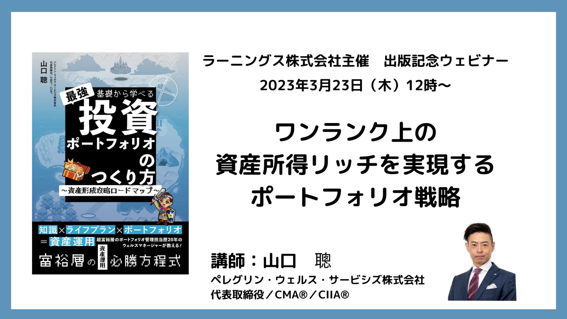 ラーニングス株式会社(本社:東京都渋谷区 代表:梶田洋平)は、3月23日(木)に『基礎から学べる最強投資ポートフォリオのつくり方~資産形成攻略ロードマップ~』(著:山口聰)の出版記念ウェビナー「ワンランク上の資産所得リッチを実現するポートフォリオ戦略」を開催します。