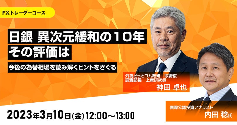 株式会社外為どっとコム(本社:東京都港区、代表取締役社長:竹内 淳)は、明日3月10日(金)12時より、当社主催の無料オンラインセミナー『「日銀 異次元緩和の10年 その評価は」 今後の為替相場を読み解くヒントをさぐる』を開催することとなりましたので、お知らせいたします。