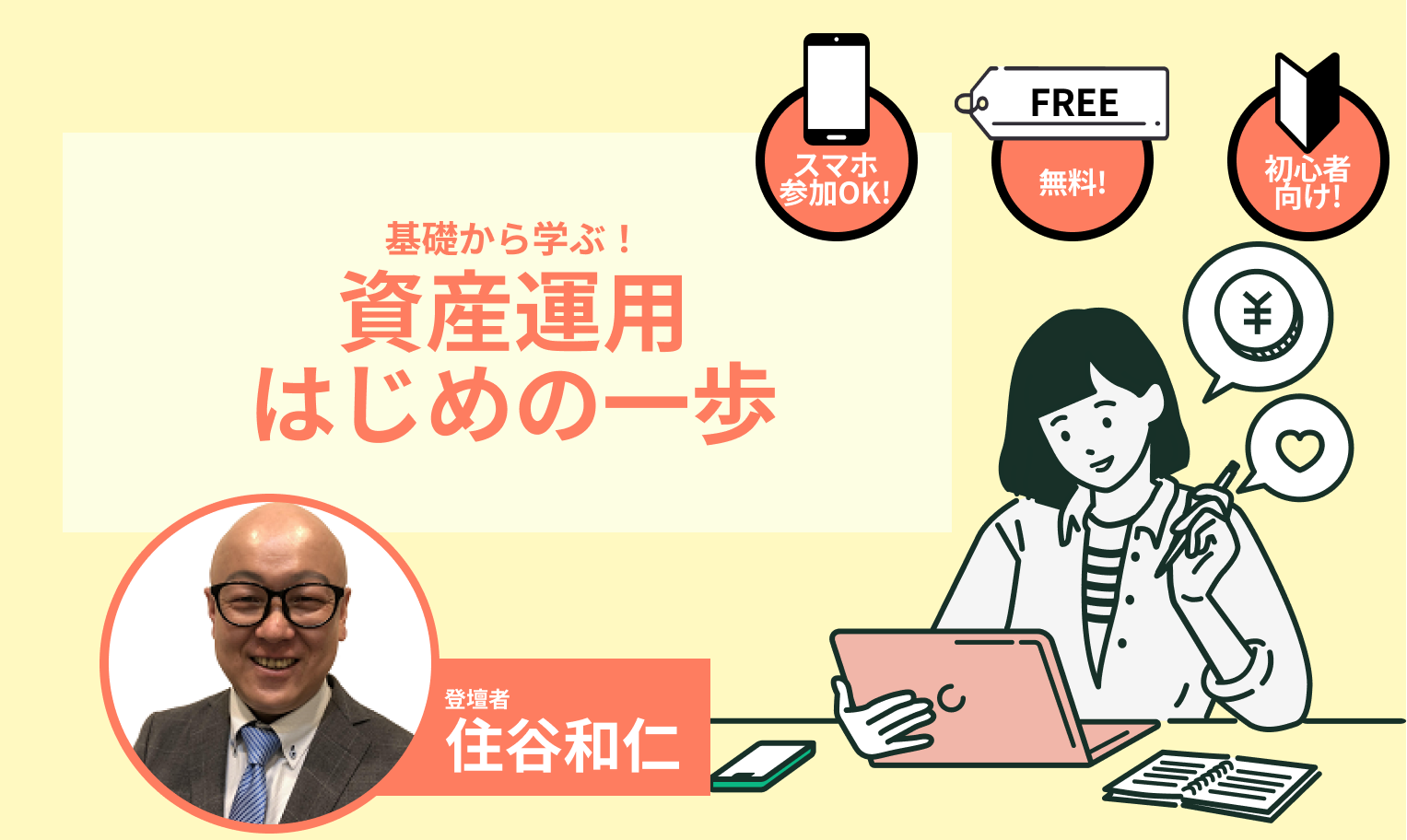 当日は、NISAやiDeCoといった証券商品も取り扱いし、柔軟な発想でお客様と一緒に問題を解決してきた講師の住谷和仁様を迎えて「基礎から学ぶ!資産運用はじめの一歩」に関するオンラインセミナーを実施いたしました。