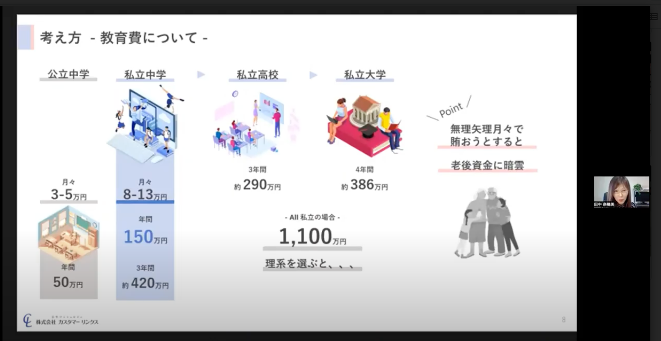 ・子供が急に私立へ行きたいと言った時のための予備校や学費などを考えて、さらに教育資金を貯めていく必要がある事がわかりました。