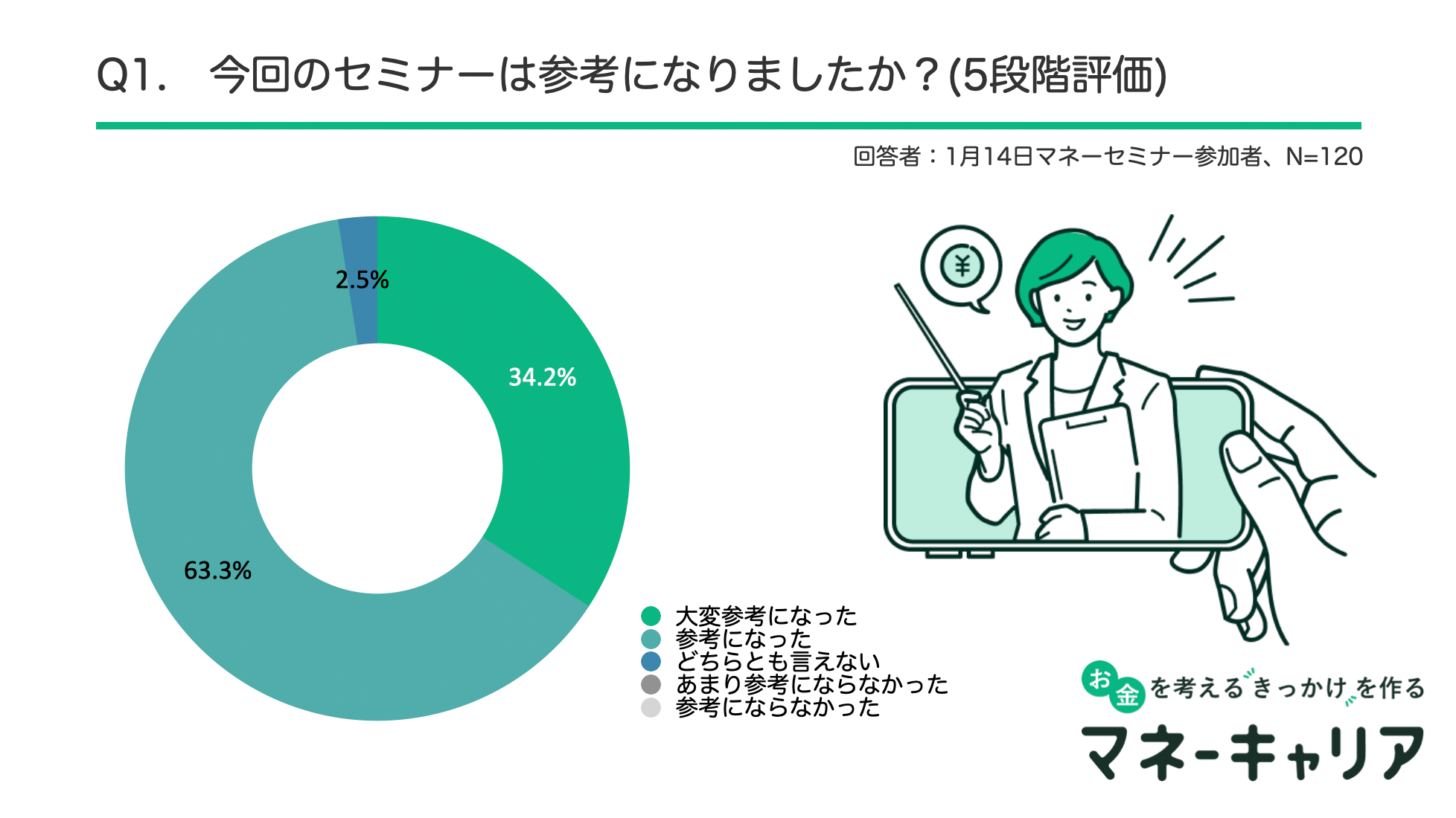 お金の相談プラットフォーム「マネーキャリア」を運営する株式会社Wizleap(東京都渋谷区、代表取締役 谷川昌平)は、2023年1月14日(土)と1月21日(土)に開催した、オンライン配信の業界最大級の金融セールス向けセミナー「基礎から学ぶ!資産運用はじめの一歩」と「~賢く教育費を準備~ 0歳から準備をする中学受験」に関するオンライン配信のマネーセミナーを実施いたしましたことを報告いたします。
