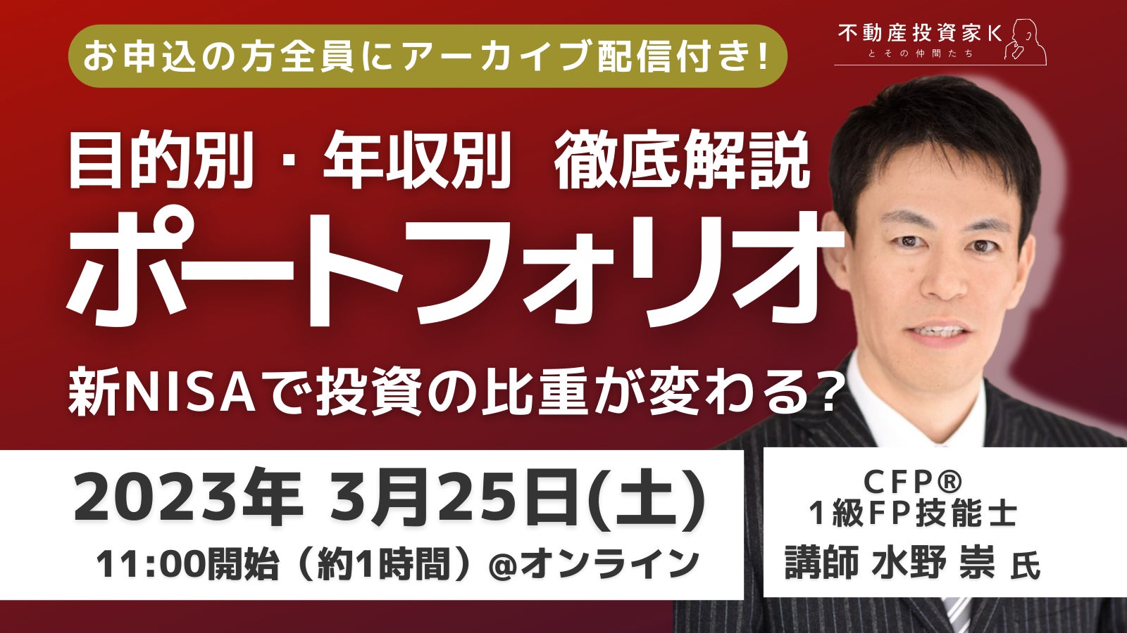 そこで、2024年から年間非課税枠が増額される新NISAとあわせて、目的別・年収別のポートフォリオを、キャリア20年以上の株式トレーダーであるCFP水野氏が徹底解説。「資産形成はNISAだけで十分?」「不動産投資の比重を下げるべき?」など新NISAに関する疑問にお答えします。