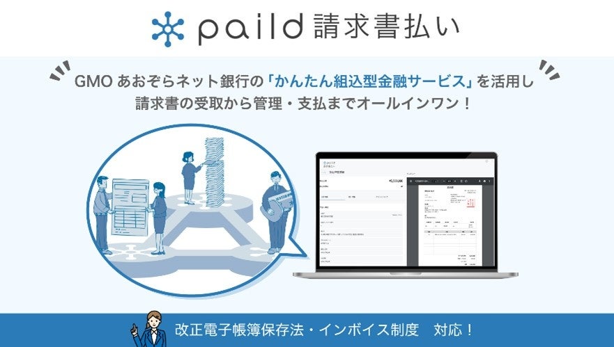クラウド型法人カード「paild」を提供する株式会社ペイルド(東京都中央区、代表取締役社長兼CEO:柳 志明、以下「ペイルド」)は、GMOあおぞらネット銀行株式会社(東京都渋谷区、代表取締役会長:金子 岳人、代表取締役社長:山根 武、以下「GMOあおぞらネット銀行」)の「かんたん組込型金融サービス」を活用した次世代型請求書受取・支払サービス「paild(ペイルド)請求書払い」を開発し、本日3月14日より提供開始します。
