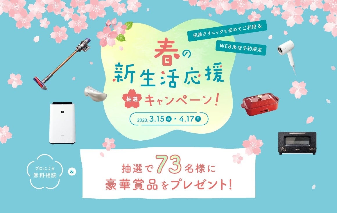 来店型保険ショップ『保険クリニック®』(全国258店舗 2023年3月15日時点、運営本部:株式会社アイリックコーポレーション 東京都文京区)は、2023年3月15日~4月17日に、「春の新生活応援抽選キャンペーン」を実施いたします。今回のキャンペーンでは、対象となるお客様の中から抽選で73名様に電化製品や日用品をプレゼントいたします。