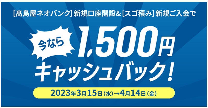 住信SBIネット銀行株式会社(本社:東京都港区、代表取締役社長(CEO):円山 法昭、以下「住信SBIネット銀行」)と株式会社髙島屋(本社:大阪市中央区、代表取締役社長:村田 善郎、以下「高島屋」)は、より多くのお客さまに高島屋 NEOBANKをご利用いただくために、2023年3月15日(水)から「新規口座開設&[スゴ積み]入会で1,500円キャッシュバックキャンペーン」を実施します。