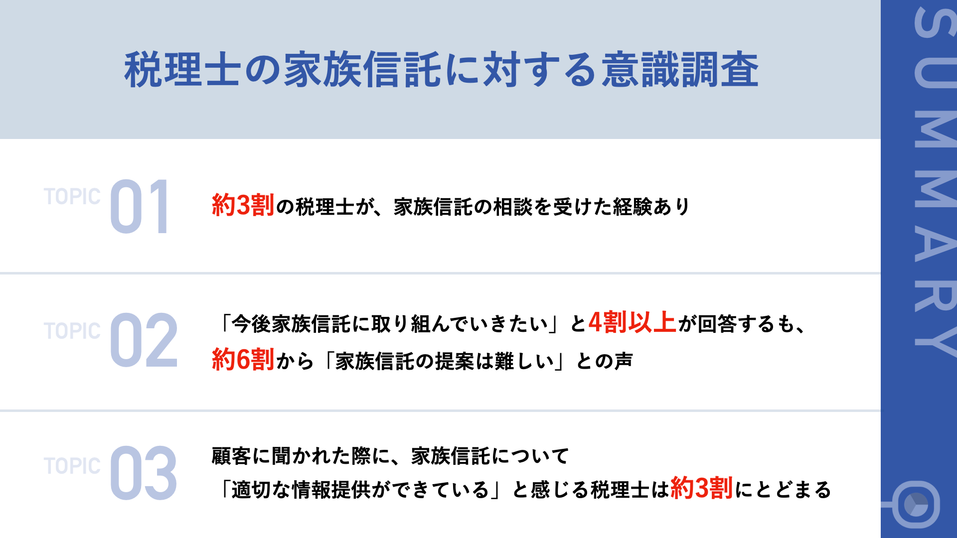 そこでより詳細な調査を行うため、本調査では税理士の家族信託に関する実態調査を行いました。
