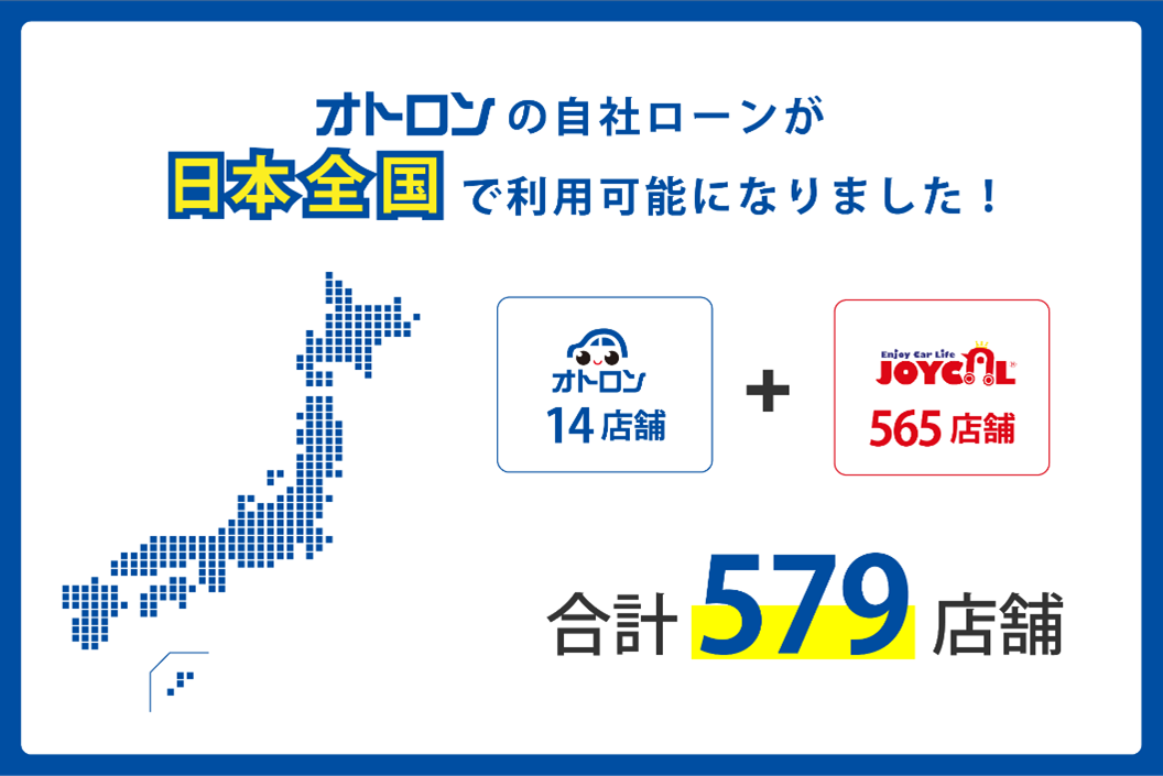 オトロンの14店舗のほか、全国565店舗のジョイカルの店舗でも「オトロンの自社ローン」をご利用いただけます。また、クルマの整備、納車、アフターメンテナンスまでもジョイカルの店舗で行うことが可能になります。