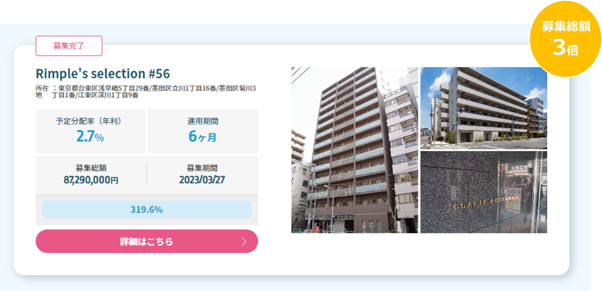 「DX」と「不動産」で価値を創造する企業、プロパティエージェント株式会社(本社:東京都新宿区、代表取締役社長:中西 聖、証券コード:3464)が運営する不動産特定共同事業法に基づく不動産投資型クラウドファンディングサービス「Rimple(リンプル)」(以下、「Rimple」)において、Rimple’s Selection#56に、2億7,902万円のご応募をいただきました。これは、募集金額8,729万円(出資総額1億2,470万円うち優先出資70%分)に対し319.6%となります。